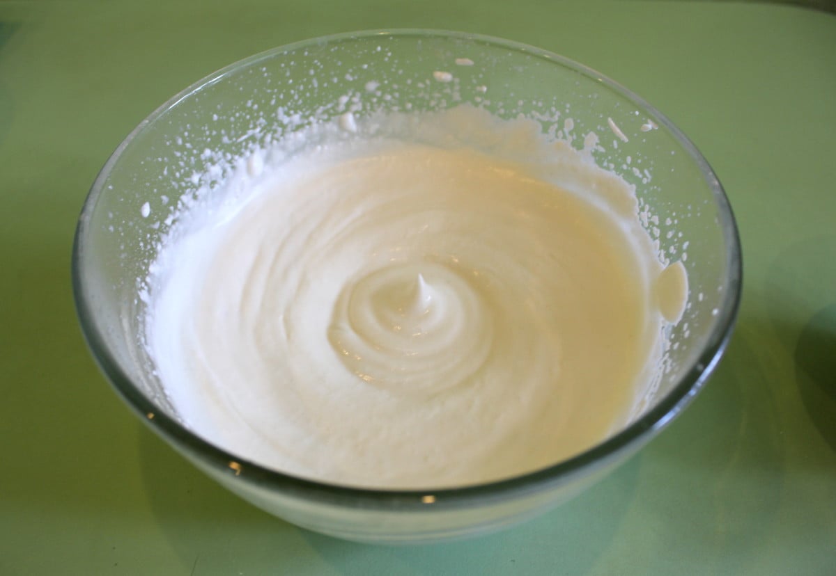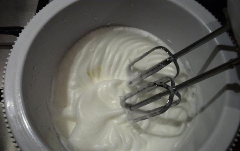 Do studeného bílku přidejte špetku soli a šlehejte, dokud nezískáte pěnu se stabilními, pevnými špičkami. Za stálého míchání shora dolů začleňte do tvarohové hmoty rozšlehanou bílou hmotu.