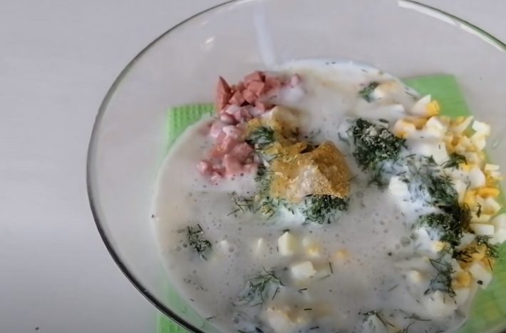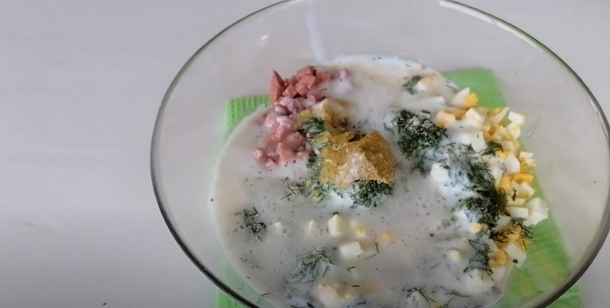 Všechny suroviny umístěte do mísy a promíchejte je s jemně nasekaným koprem, solí, mletým pepřem, sušeným česnekem, plnotučnou hořčicí a kefírem.