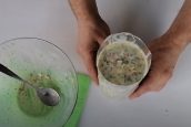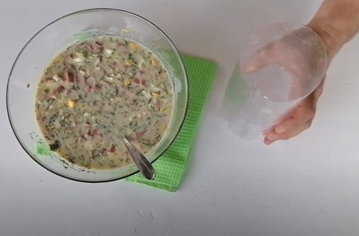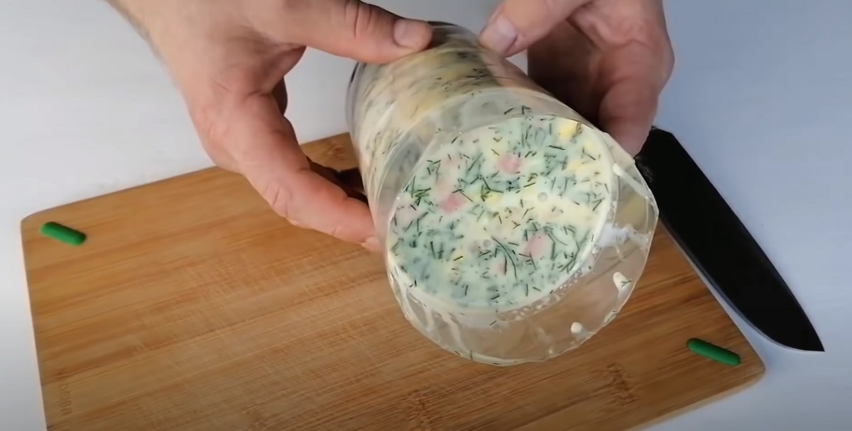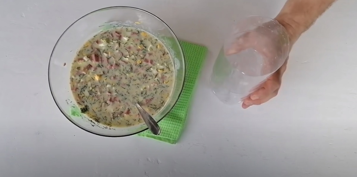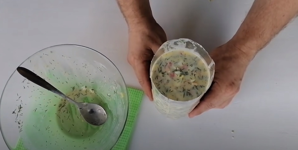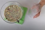 Hotovou tekutinu vlijte do směsi s uzeným kuřecím masem, pečlivě promíchejte vařečkou a těsto nakonec naneste do čisté PET lahve (objem 1 a ½ l), u které jste odřízli vrchní část s hrdlem.