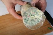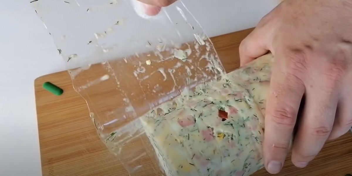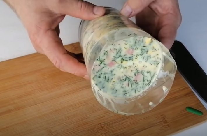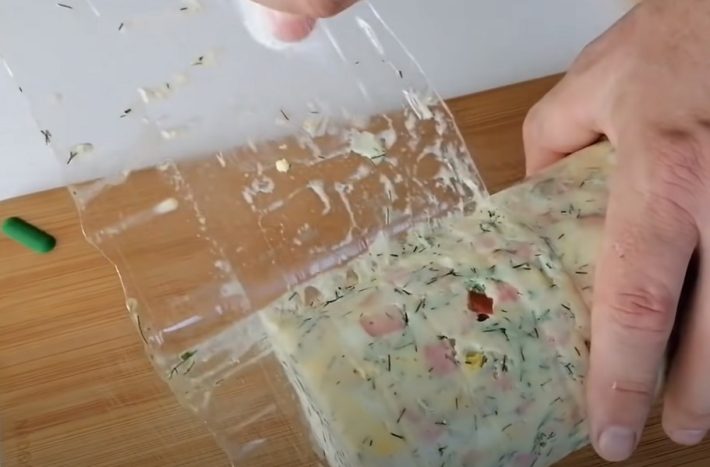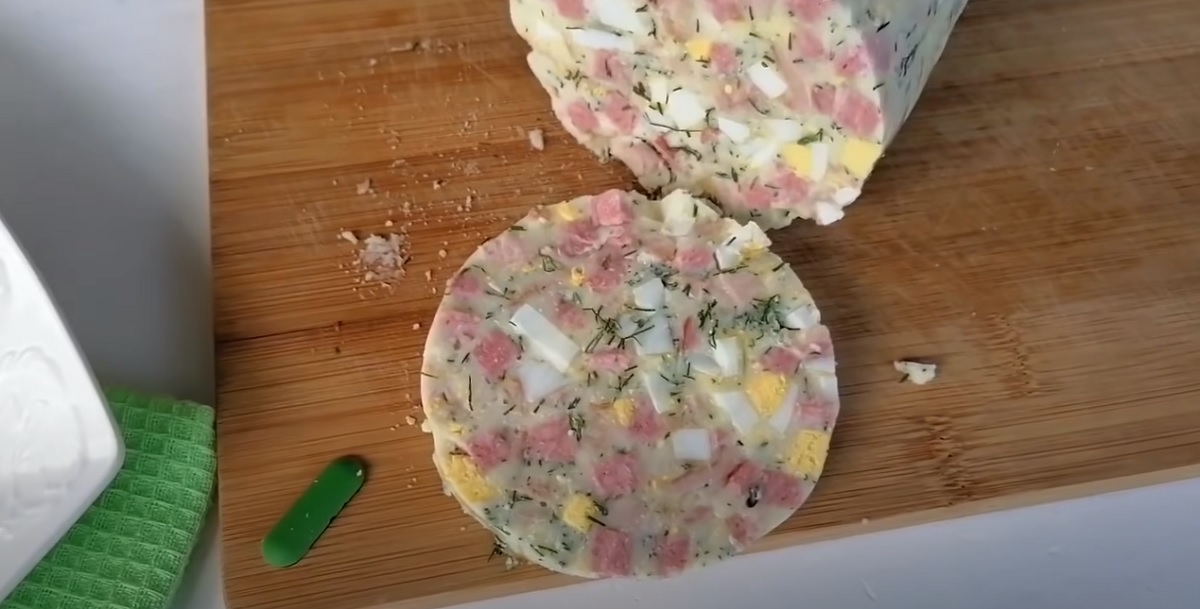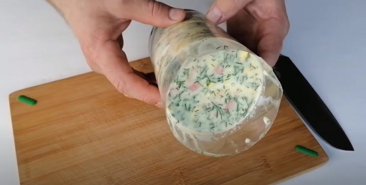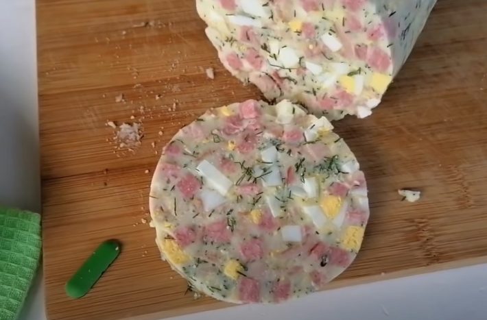 Až bude kuřecí tlačenka s čerstvým koprem, vařenými vejci, salámem a česnekem dobře ztuhlá, vyjměte ji z lednice, opatrně odstraňte plast a můžete servírovat.