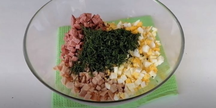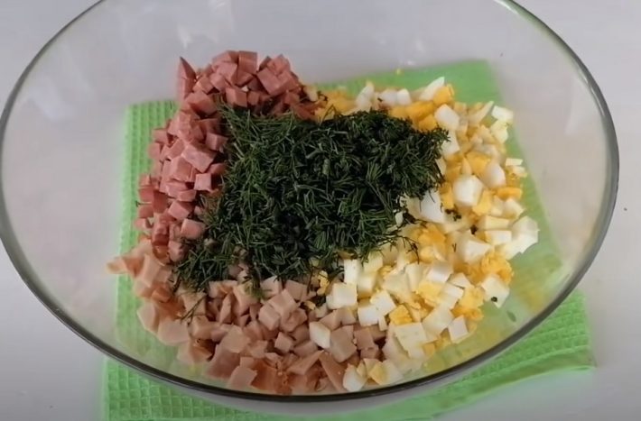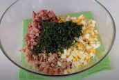 Začněte tím, že si uzené kuřecí maso nakrájíte na malé kousky, stejně tak i loupaná a vařená vejce se salámem.