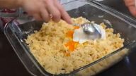Prosetou mouku smíchejte s kypřicím práškem do pečiva, cukrem a změklým máslem. Jakmile se ingredience propojí, přidejte do směsi vejce se zakysanou smetanou a vytvořte těsto.