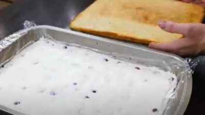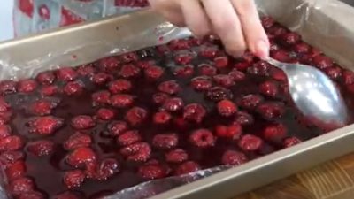 Náplň následně rozprostřete na plech, vyložený potravinovou fólií a nechte ji 15–20 minut tuhnout. Na druhý plech, vyložený pečicím papírem, rozprostřete těsto, které pečte při 180 °C po dobu 12 minut.
