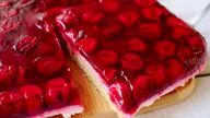 Třešňové řezy se zakysanou smetanou vložte aspoň na 2 hodiny do lednice, poté je z plechu vyklopte a servírujte je nakrájené na kousky.