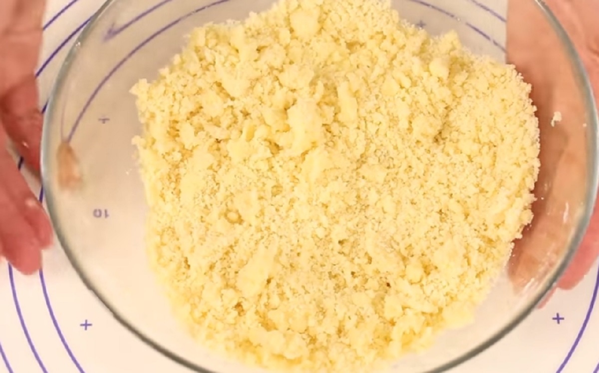 Nejprve si připravte drobenku. V míse si rozmíchejte ideálně rukou změklé máslo, moučkový cukr, hladkou mouku a vanilkový cukr. Žmolenku dejte následně do mrazáku a pokračujte výrobou těsta na korpus.