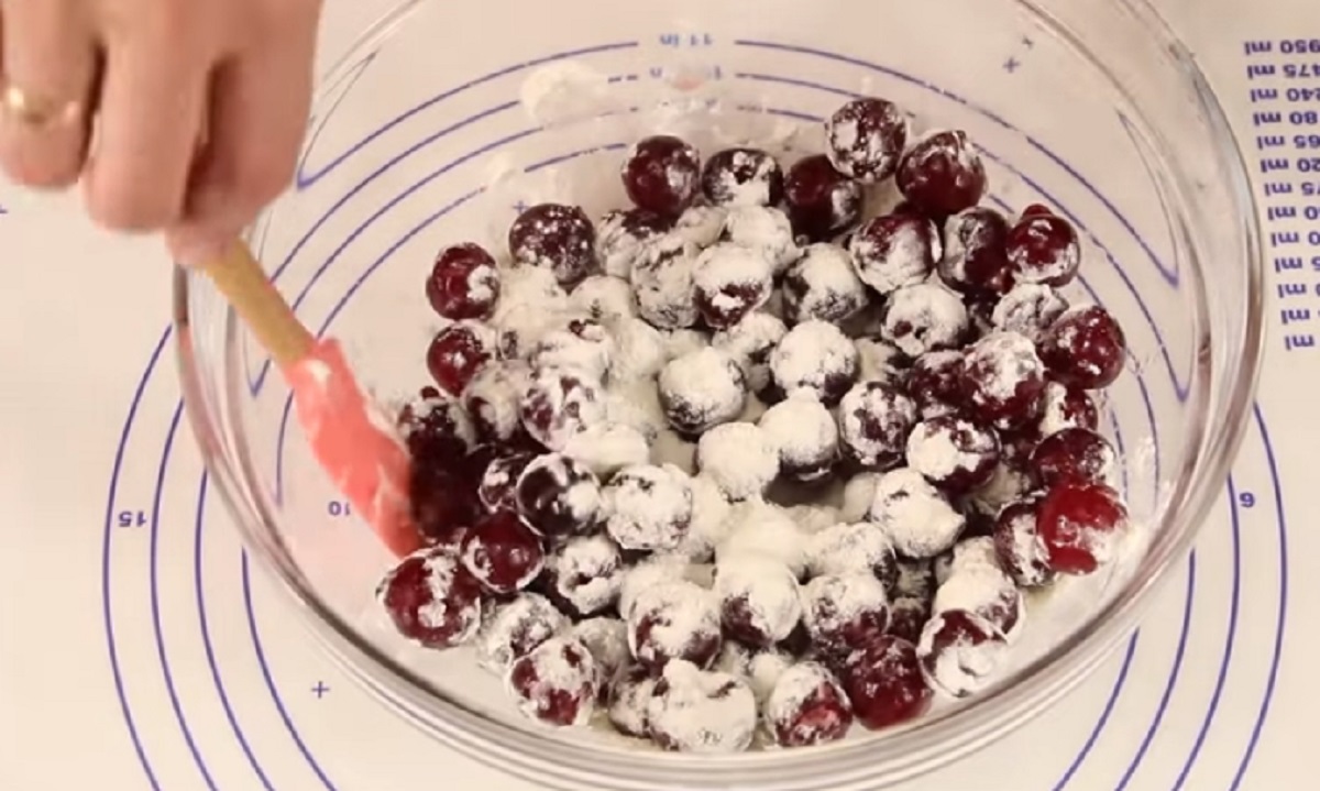 V další fázi si v misce smíchejte vypeckované třešně spolu s trochou mouky a cukru.