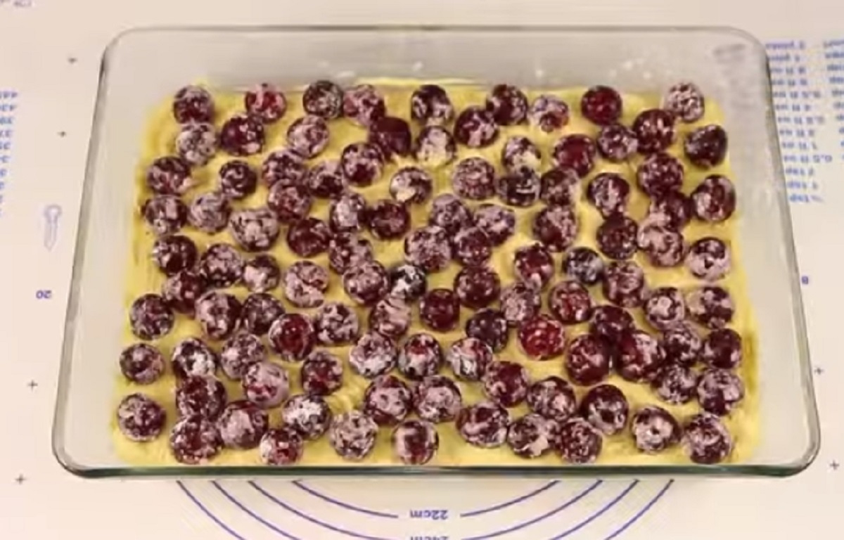 Až se koláč s třešněmi upeče, vyjměte ho z trouby a nechte vychladnout. Před podáváním můžete dezert posypat moučkovým cukrem. Porci lze doplnit i o kopeček šlehačky nebo zakysané smetany. Přejeme vám dobrou chuť.