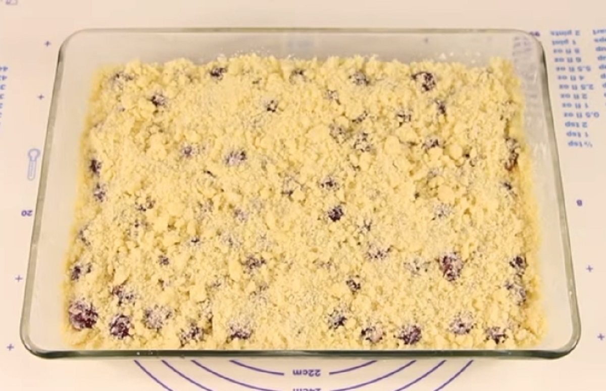 Na těsto následně poklaďte rovnoměrně třešně a zasypejte je drobenkou, která vám mezitím ztuhla v mrazáku.