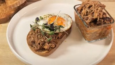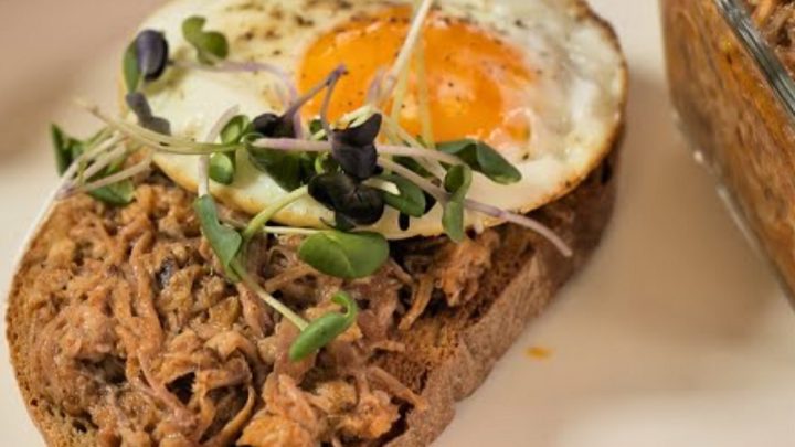Tip: Trhané vepřové maso můžete doplnit volským okem a ozdobit mikrobylinkami.