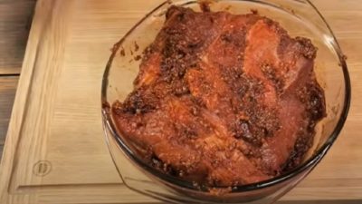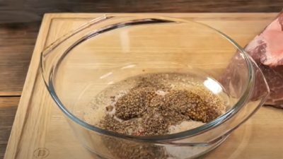 Do směsi přidejte olej a důkladně ji promíchejte. Hotovou marinádou potřete celý povrch masa, které zakryjte potravinovou fólií a dejte na noc do lednice.