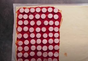 Rajský protlak smíchejte s olivovým olejem a trochou soli. Polovinu plátu listového těsta potřete protlakem. Párek nakrájejte na tenká kolečka a vyskládejte je rovnoměrně na protlak. Těsto přehněte napůl, okraje spojte a zarovnejte kolečkem na pizzu.