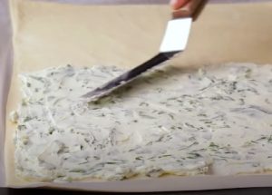 Nasekejte špenát najemno a smíchejte ho s tvarohovým sýrem. Polovinu plátu listového těsta potřete touto směsí. Těsto přehněte napůl, okraje spojte a zarovnejte kolečkem na pizzu.