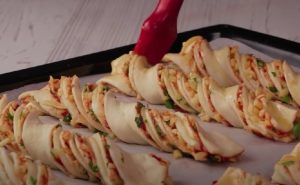 Těsto podélně rozpulte. Pak ho nakrájejte na 1 až 1,5 centimetru široké pruhy a potřete je šlehaným vejcem. Dva pruhy položte na sebe a v polovině na ně silně zatlačte například špejlí. Pak je stočte do pomyslné vrtule, každý konec opačným směrem. Položte je na plech vyložený pečícím papírem a znovu potřete šlehaným vejcem. Dejte je péct do předehřáté trouby na 180 °C po dobu 25 minut.