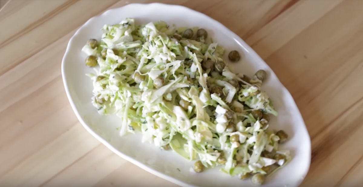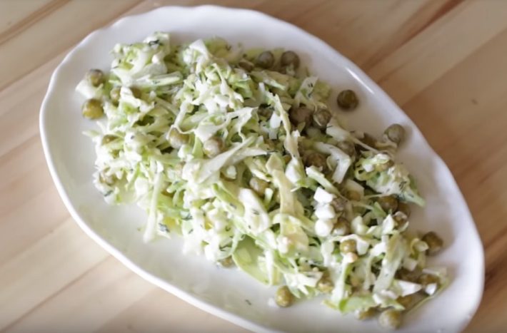 Začněte tím, že si omyjete zelí a nakrájíte ho ostrým nožem na tenčí nudličky. Pak jej umístěte do mísy a promíchejte spolu s kousky vařených vaječných bílků a s hráškem. Nakonec zeleninu zakápněte dresingem, který jste připravili s rozmixovaných vařených žloutků, zakysané smetany, plnotučné hořčice, soli, mletého pepře a nasekaného kopru. Salát podávejte vychlazený s čerstvou bagetkou. Dobrou chuť.