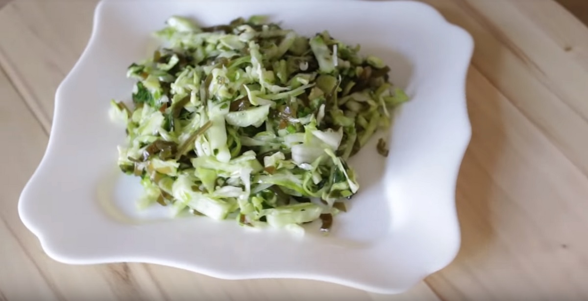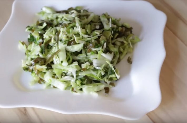 Nejprve si očistěte a omyjte hlávkové bílé zelí. Poté jej nakrájejte na menší kousky či nudličky. Zelí následně promíchejte v míse s mořskými řasami, kousky salátové okurky a nasekanou čerstvou petrželkou. Vše zakápněte dresingem připraveným z rostlinného oleje, soli, pepře a citronové šťávy. Salát podávejte buď samotný anebo s pečivem. Přejeme vám dobrou chuť.