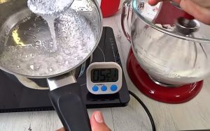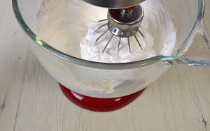 Zatímco se vaří sirup, vyklepněte tři vejce, žloutky si uschovejte do jiného receptu a bílky vyšlehejte v robotu do husté pěny spolu s jedním balíčkem vanilkového cukru, Jakmile sníh začne houstnout, přilévejte k němu tenkým pramínkem horký cukrový sirup. Pokračujte ve šlehání na nejvyšší obrátky, dokud se teplota mísy nesníží natolik, abyste na ní udrželi ruce. Dejte pozor, ať se při kontrole nepopálíte, po přilití sirupu je velmi horká. Teplota směsi by měla klesnout k hodnotám okolo 30 °C.