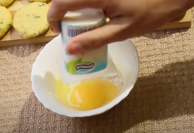 Těstíčko připravíte jednoduše tak, že do bílého jogurtu rozklepnete celé vejce, rozmícháte je pomocí vidličky a poté po troškách vmícháte také hladkou mouku.