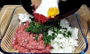Do zapékací misky vložte mleté maso, přidejte jemně nasekanou cibuli, uvařenou rýži a nasekané čerstvé bylinky. Přisypejte sůl, pepř, kurkumu, sladkou papriku, mletý koriandr a mletý římský kmín a všechny ingredience pečlivě promíchejte.