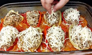 Po uplynutí 45 minut pečení odkryjte pekáč a papriky zasypejte strouhaným sýrem, který máte rádi. Poté je vraťte zpátky do trouby dopéct na dalších 10 minut, aby se sýr na povrchu roztekl a mírně očervenal.