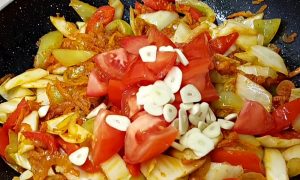 Dvě papriky nakrájejte na tenké proužky a přisypejte je do pánve k zelenině. Pokračujte v míchání, dokud se papriky mírně neopečou. Posypejte je solí a pepřem a pokračujte v restování. Řapíky z čínského zelí pokrájejte na středně velké čtverečky, přisypejte je k zeleninové směsi v pánvi a přidejte lžíci rajčatové pasty. Vše promíchejte, přidejte nakrájené rajče a na plátky pokrájený česnek a ještě pár minut za častého míchání opékejte.