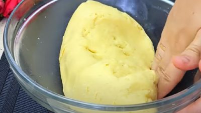 První část zabalte do sáčku a vložte do lednice na 20 minut. Druhé těsto také zabalte, ale vložte ho na 20 minut do mrazáku. Mezitím připravte náplň. V míse rozmixujte tvaroh s vejcem a 100 g cukru.