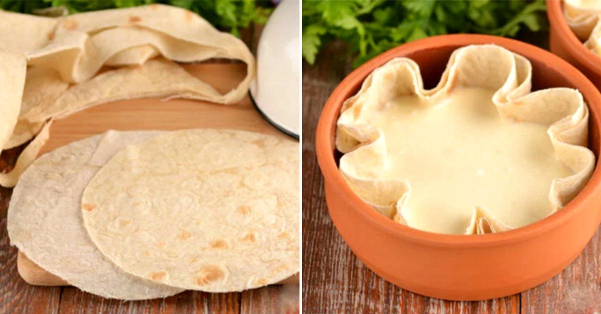 Připravte si buďto dortové formy, anebo menší zapékací misky, které jsou vhodné pro použití v mikrovlnné troubě. Uzpůsobte tortilly tak, aby se přesně vešly do zvolených nádob. Pokud zvolíte formy menší, budete muset tortilly do požadované velikosti okrojit, k čemuž můžete použít hranu zvoleného nádobí. Mějte na paměti, že jeden koláč bude umístěn do dvojité tortillové mističky.
