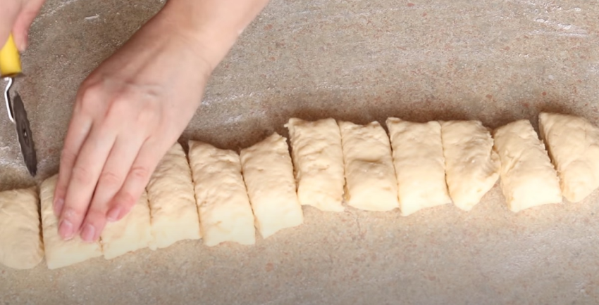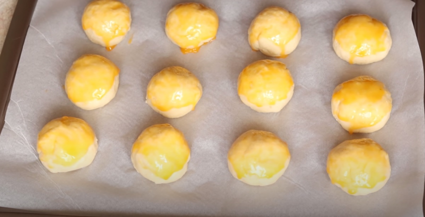 Těsto vyválejte na dlouhý válec a rozdělte ho na 12 menších kousků, pokud možno stejné velikosti. Z kousků těsta pak vyválejte malé kouličky a vyrovnejte je na papírem vyložený plech.