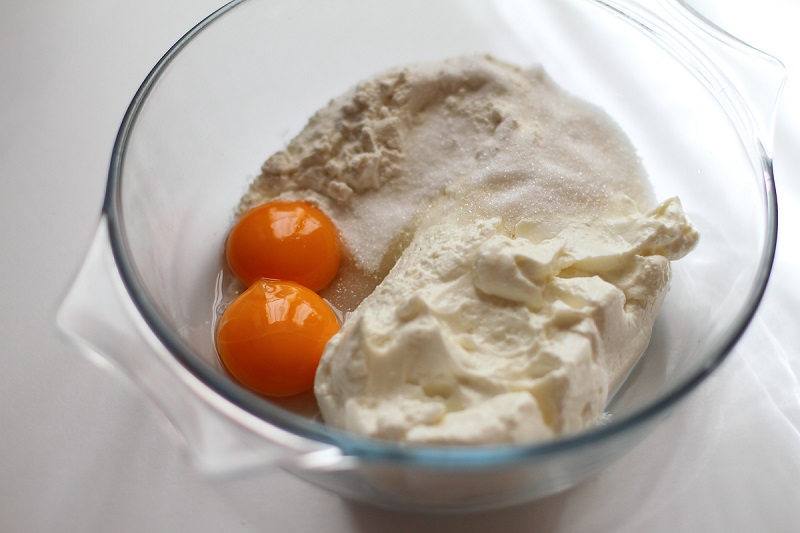 Tvaroh rozdělte v poměru jedna ku třem, přičemž čtvrtku si v lednici schovejte na pozdější přípravu náplně a tři čtvrtiny množství vložte do hluboké mísy. K tvarohu v míse přidejte čtyři vaječné žloutky, jednu nebo dvě lžíce cukru, podle toho, jak moc sladké pečivo preferujete, a všechno společně rozmíchejte do hladké konzistence. Nejlépe vám to půjde s použitím elektrického šlehače či ponorného mixéru.