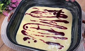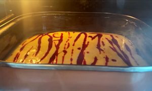 Čtvercovou formu na pečení o rozměrech 20×20 cm bohatě vymažte máslem a vlijte do ní polovinu připraveného těsta. Rozprostřete ho do rovnoměrné vrstvy po celé ploše dna. Rozmíchejte džem, aby byl tekutý, naberte jej na lžíci a vytvořte jím na povrchu těsta cákance. Poté přilijte i druhou polovinu těsta a postup s marmeládovým tygrováním opakujte.