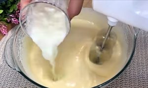 Do misky rozklepněte tři vejce a vyšlehejte je s vanilkovým a obyčejným cukrem do pěny. Přidejte slunečnicový olej a bílý jogurt a pokračujte ve šlehání, dokud obojí do směsi dobře nezapracujete. Po částech vsypte do směsi hladkou mouku spolu s práškem do pečiva a dobře promíchejte. Výsledkem bude polotekuté těsto.