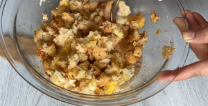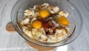 Starý gumový chléb natrhejte na velmi malé kousky a vložte ho do velké hluboké misky. K natrhanému chlebu vyklepněte tři vajíčka, posypejte kořením (my jsme použili po jedné lžičce tymiánu, sušeného česneku a sladké mleté papriky, ale toto množství si můžete i přizpůsobit podle sebe, případně použít i jiné druhy svého oblíbeného koření. Jestli chcete, těsto si podle chuti i přisolte.