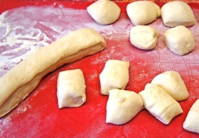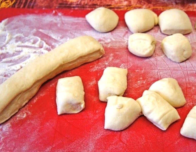 Po vykynutí vytvořte na válu bochánky a z nich vypracujte požadované tvary. Naplňte připravenou náplní, zabalte a okraje zatlačte, aby náplň při pečení nevytekla. Nechte ještě kynout. Před vložením do trouby potřete rozšlehaným vajíčkem, můžete ozdobit sezamem, hrubozrnnou solí nebo dýňovými semínky.