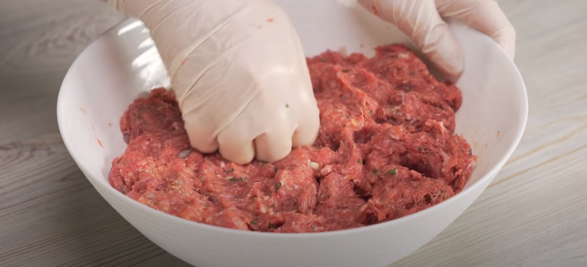 Mleté maso dejte do hluboké mísy, přidejte sůl, muškátový oříšek, česnek, pepř, mleté nové koření, nasekanou petrželku, cibuli nadrobno, strouhanku a vejce. Směs důkladně promíchejte.