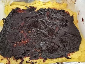 Plech na pečení vyložte alobalem a pečicím papírem, který vymažte sádlem a dovnitř rozprostřete bramborové těsto. Bramborovou placku pokapejte rozpuštěným máslem nebo sádlem a vložte ho do trouby rozehřáté na teplotu 160 °C péct dorůžova.