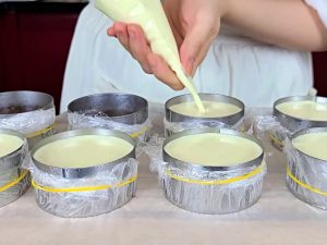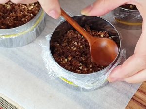 Připravte si kulaté formičky o průměru 7 cm a výšce 3,5 cm, které zevnitř vyložte přilnavou potravinářskou fólií a dovnitř vložte kulatý papírový kruh o stejném průměru, který bude fungovat jako podtácek. Každou formu naplňte asi 30 gramy sušenkové hmoty, kterou důkladně upěchujte na dno do kompaktní vrstvy. Formičky s korpusem vložte do lednice vychladit a ztuhnout po dobu 30 minut.