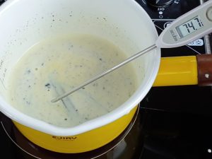 Do rendlíku nalijte mléko a postavte ho na sporák. Rozkrojte vanilkový lusk, seškrábněte zevnitř dužninu, kterou vhoďte do mléka v hrnci, a přihoďte také zbytek lusku rozkrájený na čtvrtky. Do mléka přidejte 1 lžíci cukru a směs zahřívejte, dokud se cukr nerozpustí a mléko téměř nezačne vřít. Těsně před bodem varu jej odstavte ze sporáku a vmíchejte ho do rozšlehaných žloutků. Tuto směs vraťte zpátky do hrnce s vanilkovým luskem a zahřejte ji na sporáku na teplotu kolem 78 až 82 °C (pomozte si ponorným teploměrem).