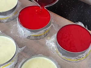Krém ze zdobicího sáčku vlijte do formiček s vychlazeným sušenkovým korpusem tak, abyste nechali asi 3 mm volného prostoru na ovocnou želatinu. Naplněné formičky vložte na 1 hodinu do mrazáku, aby krém ztuhl.