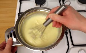 Do kastrůlku vyklepněte dvě vajíčka, přidejte k nim 100 gramů cukru, vanilkovou esenci a kukuřičný škrob. Metličkou vše jemně vyšlehejte do jednolité konzistence. Přilijte k ní mléko a postavte na kamna. Na mírném ohni směs přiveďte k varu a za stálého míchání ji vařte, dokud nezíská konzistenci hustého pudinku. Poté kastrůlek odstavte z kamen a nechte pudink vychladnout, přičemž jeho povrch zakryjte potravinářskou fólií tak, aby ležela přímo na hladině. Díky tomu se nevytvoří škraloup.
