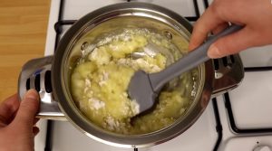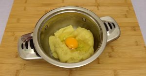 Když je těsto hotové, odstavte ho z kamen. Vyklepněte tři vajíčka a po jednom je přidávejte do těsta, přičemž každé vajíčko nejprve důkladně zapracujte do hmoty, než přidáte další. S touto prací vám velmi pomůže kuchyňský robot. Pokud ho ale nemáte, zvládnete to snadno i ručně. Výsledkem by mělo být husté a vazké těsto, které je docela podobné husté bramborové kaši.