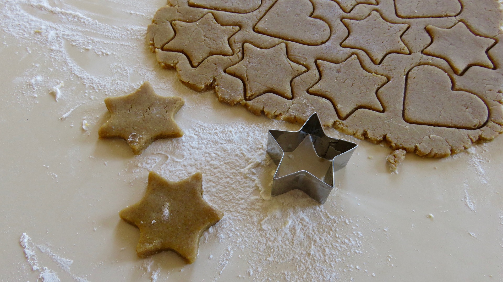 Poté těsto vyndejte na pracovní plochu, rozválejte ho na silnější plát a s pomocí vykrajovátek z něho vykrájejte různé tvary podle libosti. Ty pak vyskládejte na plech vyrovnaný pečicím papírem a vložte do trouby péct při teplotě 180 °C po dobu kolem 8 minut.