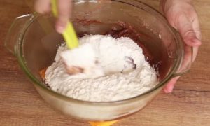 Do mísy dejte změklé máslo, cukr a sůl a vše dokonale promíchejte. Přidejte olej a vejce a opět promíchejte. Prosejte do mísy kakao a znovu promíchejte. Poté přidejte postupně prosátou mouku a prášek do pečiva a vymíchejte těsto, v pozdější fázi budete muset použít ruce. Vypracované hladké těsto zabalte do fólie a dejte na 20 minut do lednice.