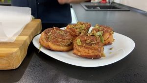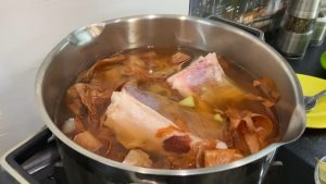 Vařená slanina v cibulových slupkách ochucená pastou z česneku a bobkového listu - postup přípravy