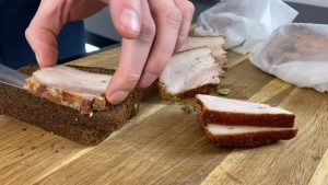 Takto připravenou slaninu vložte do ledničky a nechte je nejlépe přes noc odpočívat (minimálně ale 5 nebo 6 hodin v kuse). Nakonec kousky vyndejte z lednice, vybalte je z papíru a nakrájejte na silné plátky, které podávejte s velikou chutí a čerstvým pečivem mazaným máslem a doplněné o nakládané okurky nebo jinou zavařenou zeleninu. Můžete také kusy slaniny vyskládat do sklenice, zalít nálevem z hrnce a zavařit je tak, aby vám vydržely na horší časy.