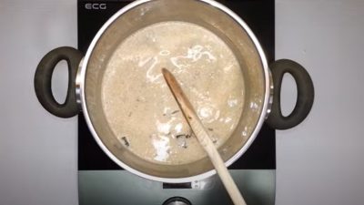 Upečené maso vyjměte a odložte bokem. Zbytek ingrediencí přendejte do hrnce a začněte je zahřívat. Do hrnce vlijte také smetanu smíchanou s moukou, pokrm osolte a vařte 15 minut, do zhoustnutí.