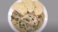 Vepřovou kýtu na houbách podávejte s připravenou omáčkou a knedlíkem.