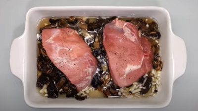 Dno zapékací mísy pokryjte nadrobno nakrájenou cibulí a sušenými houbami. Na tyto suroviny položte oba kusy masa a jejich okolí posypte drceným kmínem.