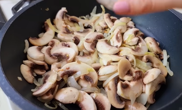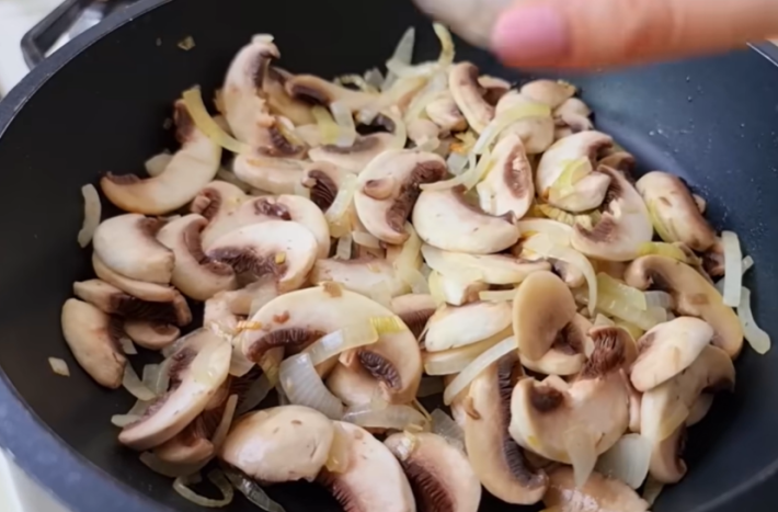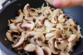 Jako první si nakrájejte zeleninu. Začněte cibulí, kterou oloupejte, překrojte na dvě poloviny, tu dále rozpulte a krájejte na nudličky. Na pánev nalijte trochu oleje a začněte na něm cibuli restovat. Když trochu zhnědne, přidejte na plátky nakrájení žampiony. Restujte, dokud cibule a houby nezměknou. Následně je osolte, promíchejte a dejte stranou do mísy.