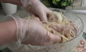 Očistěte žebra, zbavte je blan a rozkrájejte na menší kusy. Dejte je do velké mísy. Rozkrájejte cibuli na půlkolečka a přidejte ji k masu. Poté ho okořeňte pepřem a mletým koriandrem. Dále přidejte 2 lžičky soli, majonézu, 2 lžíce olivového oleje a worcesterovou omáčku. Vše promíchejte a nechte maso 2 hodiny marinovat.