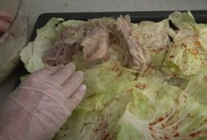 Ze zelí oddělte celé listy, seřízněte řapíky a rozložte je na plech vymazaný olivovým olejem. Přidejte trochu bazalky, uzené papriky nebo jiného koření a osolte. Navrch rozložte marinované maso i s cibulí. Rozehřejte troubu na 200 °C a pečte maso 60 až 80 minut, dokud není krásně měkké. Pokud by se připalovalo, lze plech přikrýt alobalem.