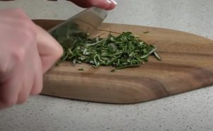 Mezitím oloupejte brambory, nakrájejte je a dejte je vařit ve slané vodě se sodou. Na pánev dejte olivový olej, nasekejte rozmarýn a krátce ho osmažte. Potom k němu přidejte lisovaný česnek a smažte dál asi minutu, pozor ale, nesmí se připálit. Následně olej slijte přes síto, ale koření nevyhazujte.